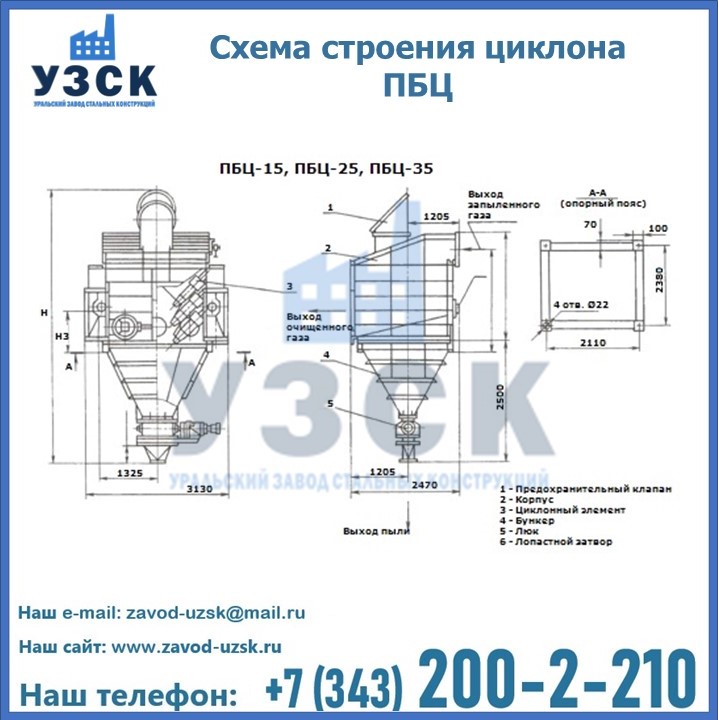 Завод «УЗСК» в Миассе предлагает приобрести циклоны ПБЦ и прочие устройства, полностью укомплектованные и готовые к эксплуатации. Мы гарантируем соответствие оборудования всем требованиям ГОСТ и ТУ, износостойкость и высокую производительность предлагаемого оборудования. Уральский Завод Стальных Конструкций изготавливает и продает надежное, эффективное и производительное оборудование, имеющее длительную гарантию и большой эксплуатационный ресурс. Если требуется изготовить циклон нестандартных размеров, то такой вариант выполнения заказа тоже предусмотрен, так как предприятие имеет собственные производственные площади и надежных поставщиков. На все поставляемое или производимое оборудование имеются чертежи и прочая техническая документация. Заказать и купить циклоны или прочее оборудование высокого качества и по доступной цене можно через наш сайт или по указанному в разделе «Контакты» телефону.